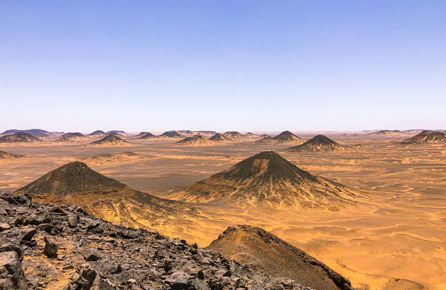 El Desierto Negro está en el Desierto Occidental, al sur del Oasis de Farafra. El nombre proviene del basalto negro que cubre las montañas, colinas y arenas, dándoles la apariencia de llevar sombreros negros. Este material está presente en todas partes en los lados de las montañas y otras tierras altas.
